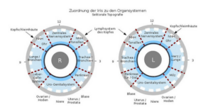 Es werden beide Augen nacheinander betrachtet. Die Beschwerden der rechten Körperseite spiegeln sich in der linken Iris und umgekehrt.